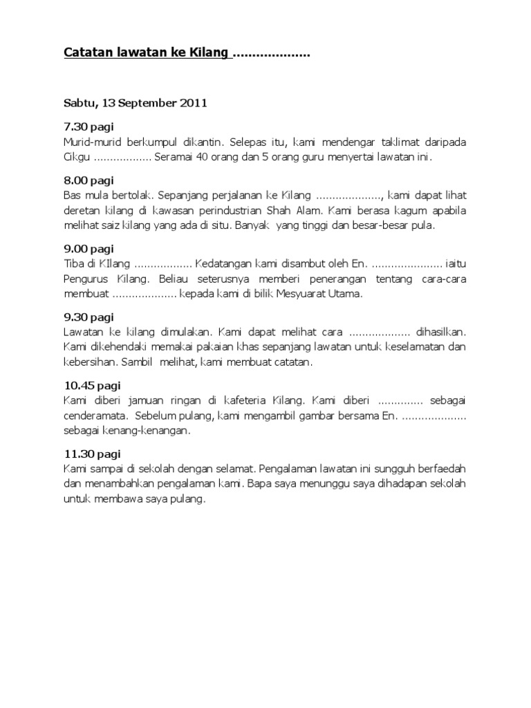 Contoh karangan 7Laporan lawatan ke kilang nanas. Kami bertolak dari sekolah pada pukul 800 pagi dan tiba di Pusat Sains Negara pada pukul 930 pagi. Seronoknya kamu ya Adli.
